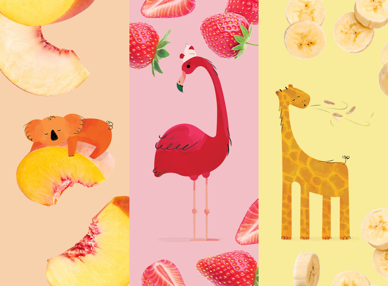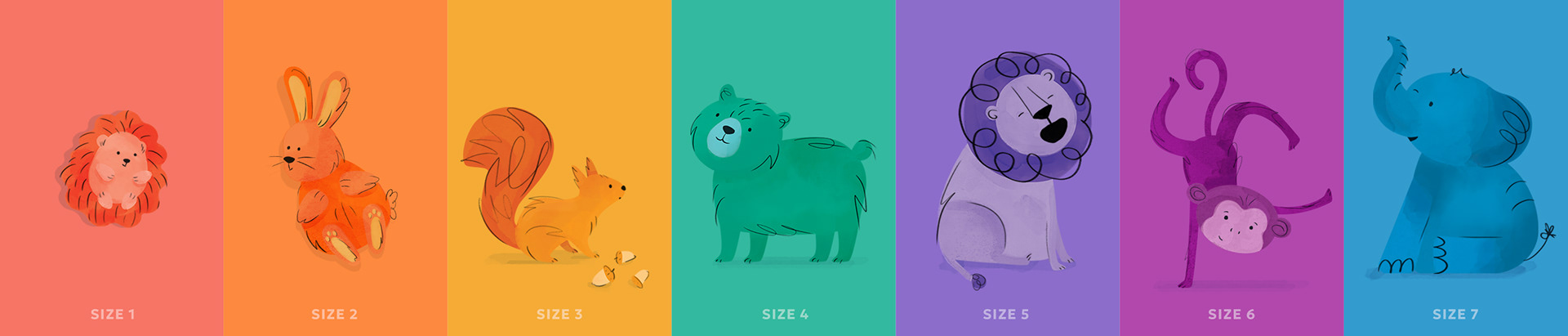 The range is built around a friendly cast of illustrated animals, each aligned with a bright colour palette to aid product navigation. Drawn with soft watercolour brushstrokes, the animals grow with babies - in size and energy - and playfully interact with photography.